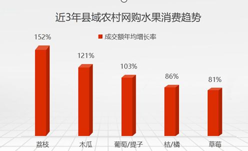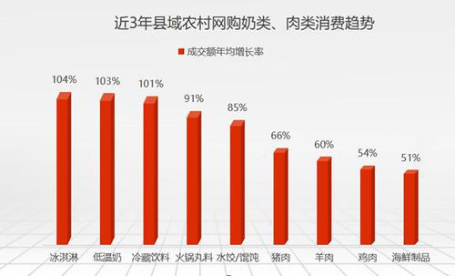 食品消费是农村消费升级的缩影。近三年,水果、奶制品、肉类等在农村生活品类线上消费占比中有显著提升,说明的是食品消费结构的变化,随着生活水平的提高,饮食观念也发生着变化,一是以奶制品为代表的营养食品渐受青睐,二饮食结构搭配更均衡,这在猪、羊、鸡肉、海鲜都有不同程度涨幅中都有体现,值得一提的是,火锅丸类、水饺云吞等冷冻速食类商品的需求越来越高,与城市消费的特点越来越趋同;三除了讲究营养,吃得健康外,吃新鲜、吃时令也成了农村食品消费需求的重要触发点,其中以荔枝、木瓜为代表的等热带水果年均增长率达152%。农村食品消费从实惠吃饱走向尝鲜吃好的趋势十分明显。