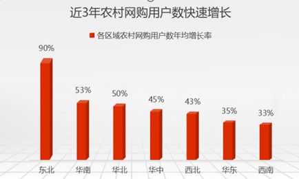 近3年,全国各区域的农村网购用户数都实现了快速增长,其中东北、华南、华北的增速最为亮眼。