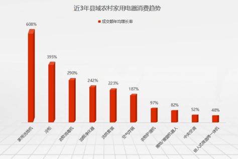在双循环新格局之下,进一步加速带动了县域农村地区商业用电器的线上消费显著增长,特别是近三年,农村商业用热水器、吸尘器、洗碗机等餐饮行业类电器等品类销售,呈现了2倍、5倍、甚至10倍的增长态势,这也进一步印证了农村商业的加速繁荣及县域农村地区人们生活水平及消费实力的提升。