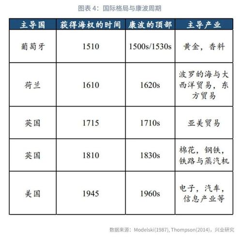 正因为经济实力决定政治地位,国际政治周期与康波周期(指商品经济中存在的一个为期50-60年的长周期)密切相关。在过去5轮的政治周期中,有4轮周期中的主导国获得海权时间较康波周期顶部早10至20年,仅在1轮周期中主导国获得海权时间较康波顶部晚10年。