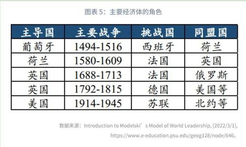莫德尔斯基认为,1494年以来的国际政治共经历5轮周期。这5轮周期中,国际格局的主导国分别是葡萄牙、荷兰、英国、英国和美国。如果以每一轮主导国的海军实力取得全球绝对优势的时间来划分,上述5轮周期的起始时间分别为1510年、1610年、1715年、1810年和1945年,周期平均长度约为109年。