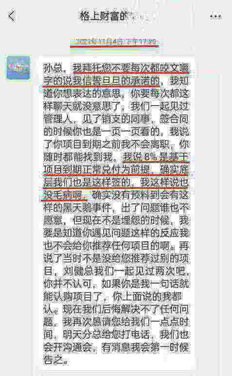 此时,格上理财的销售人员却不认可保收益的许诺。2021年11月4日,销售人员说:“8%确实是业绩比较基准。”之后又说,“不要每次都咬文嚼字,说我信誓旦旦地承诺(保收益)……8%是基于项目到期、正常兑付为前提,底层我们也是这么签的,我这样说也没毛病。”