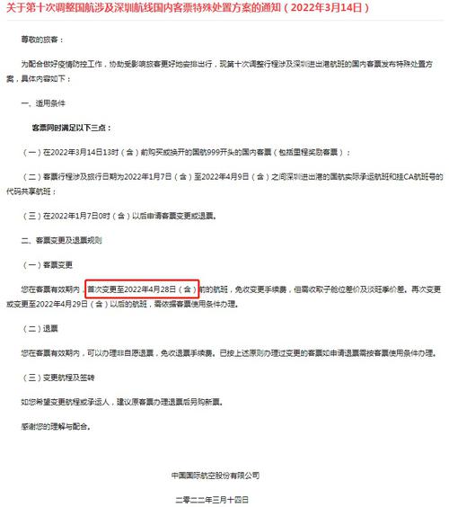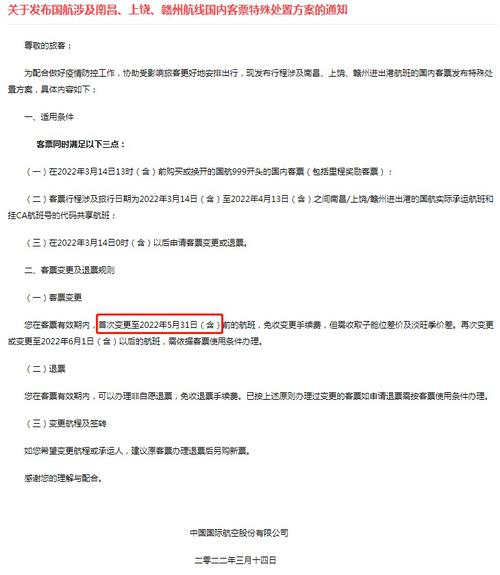 3月14日,中国国际航空相继发布《关于调整国航涉及烟台航线国内客票特殊处置方案的通知》《关于第十次调整国航涉及深圳航线国内客票特殊处置方案的通知(2022年3月14日)》《关于发布国航涉及南昌、上饶、赣州航线国内客票特殊处置方案的通知》,公布行程涉及山东烟台,深圳,江西南昌、上饶、赣州进出港航班的国内客票特殊处置方案: