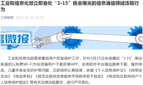 “工信微报”微信号3月16日上午消息,工业和信息化部高度重视用户权益保护工作,针对3月15日央视播出“3·15”晚会报道的以免费Wi-Fi为名诱骗用户下载恶意APP、应用软件平台强迫捆绑下载、骚扰电话、儿童手表安全防护等问题,立即组织认真核查,依据《个人信息保护法》《网络安全法》《电信条例》《规范互联网信息服务市场秩序若干规定》《电信和互联网用户个人信息保护规定》等有关法律法规要求,进行严厉查处。