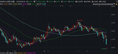 二级市场上,双汇发展股价15日开盘即下跌,当日收报25.13元/股,跌9.99%。16日开盘,双汇发展延续跌势,盘中最深跌幅达6.49%报23.50元/股。股价两个交易日跌幅累计超15%。(中新经纬APP)