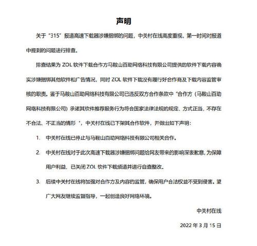 中关村在线15日晚间声明,经公司排查,ZOL软件下载合作方马鞍山百助网络科技有限公司提供的软件下载内容确实涉嫌捆绑其他软件和广告情况,同时ZOL软件下载没有履行好合作商及下载内容监管审核的职责。
