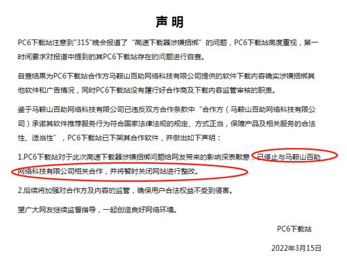 PC6下载站官网声明,PC6下载站对于此次高速下载器涉嫌捆绑问题给网友带来的影响深表歉意,已停止与马鞍山百助网络科技有限公司相关合作,并将暂时关闭网站进行整改。后续将加强对合作方及内容的监管,确保用户合法权益不受到侵害。