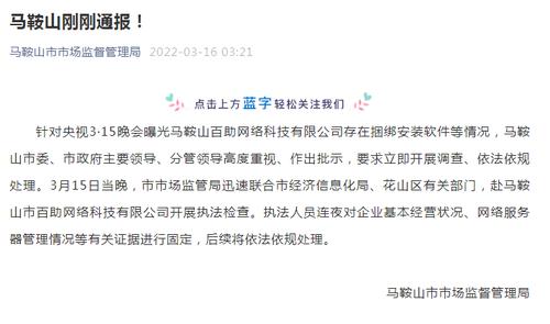 马鞍山市市场监督管理局官方微信号16日凌晨通报称,针对央视3·15晚会曝光马鞍山百助网络科技有限公司存在捆绑安装软件等情况,3月15日当晚,马鞍山市市场监管局迅速联合市经济信息化局、花山区有关部门,赴马鞍山市百助网络科技有限公司开展执法检查。
