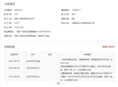 如今,汤臣一品的价格可达每平方米约27万元,根据面积大小不同,平均每套房价格从1.6亿元到2亿多元不等。此外,汤臣一品的物业管理费为15元/平方米/月。