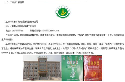 据岳阳市农业农村局2017年8月披露的“岳阳市特色农产品品牌名录之企业和产品品牌”,插旗菜业名列其中,且企业电话“135XXXX5555”也被披露。