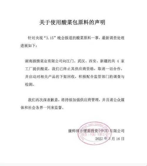 3月15日深夜,康师傅发布声明表示,湖南插旗菜业有限公司是该公司酸菜供应商之一,康师傅已立即中止其供应商资格,取消一切合作,封存其酸菜包产品,积极配合监管部门调查与检测。