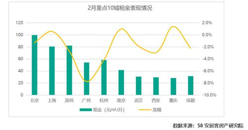 58同城、安居客统计数据显示,2月重点10城整体租金水平有所回落,仅上海、南京和重庆处于上涨状态,广州、杭州跌幅相对显著。2月,春节假期效应叠加部分城市受疫情影响,导致租金水平在一定程度上有所回落。从绝对租金水平来看,北京2月租金回落至100元/㎡/月以内,上涨压力有所缓解,但仍位居全国第一。武汉、西安、成都和重庆,在经历去年租金的上涨后,整体水平位于30元/㎡/月左右,租房压力相对较小。