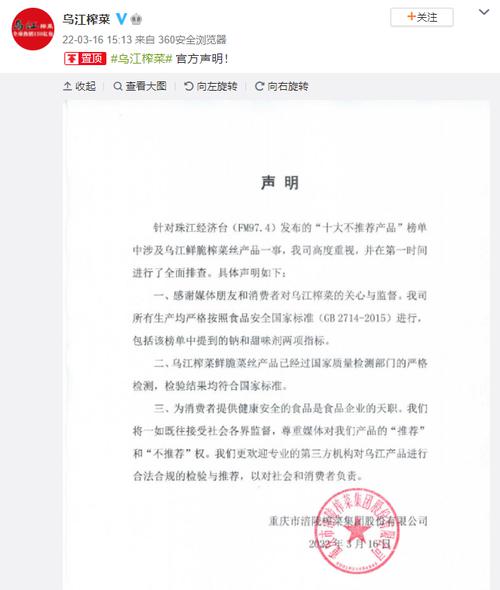 4丨乌江榨菜回应被列入十大不被推荐产品榜单:生产均严格按照食品安全国家标准进行