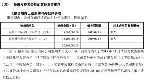 记者注意到,报告期内益坤电气存在两起已结束的对外担保事项,分别为温州市中际化纤有限公司(以下简称中际化纤)、温州升阳塑业有限公司(以下简称升阳塑业)担保800万元、1210万元,两家公司都出现债务逾期,导致益坤电气需承担连带责任。