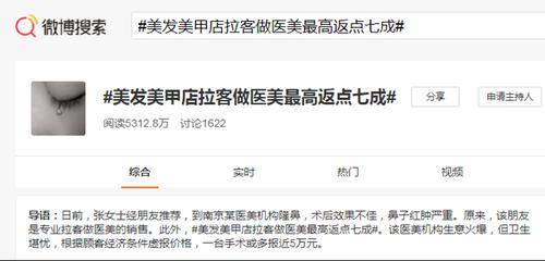 《每日经济新闻》记者就曾在多个美甲店遭遇“医美推销”,销售项目从针剂注射、光电类抗衰项目甚至医疗手术项目不一而足。记者了解到,如果美甲店成功将客户带到其合作的医美机构接受医美服务,返点从客单价的20%至30%不等。2021年3月,一则“美发美甲店拉客做医美最高返点7成”的话题就曾登上网络热搜。