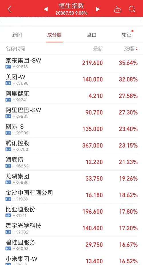 港股今天也大幅走强。恒生指数放量收涨9.08%报20087.5点,重新站上2万点,为2008年10月30日以来最大单日涨幅;恒生科技指数大涨22.2%报4243.39点,创史上最大单日涨幅。京东、美团均涨超30%,领涨恒指成分股;阿里巴巴、阿里健康涨超27%,腾讯、网易涨超23%。