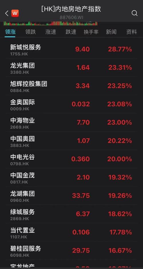 个股方面,A股宋都股份、新华联、泰禾集团涨停;港股方面,旭辉控股、龙光集团、中国奥园涨超20%。融创从下跌近20%到一度上涨逾15%,收盘涨7%。