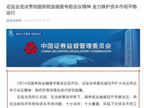 据“证监会发布”,3月16日国务院金融委专题会议召开后,证监会党委迅速召开扩大会议传达学习会议精神,就抓好贯彻落实进行研究部署。