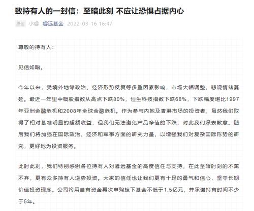 此外, 睿远基金还给投资人发了一封信:至暗此刻 不应让恐惧占据内心。