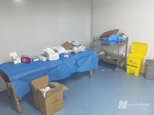 《每日经济新闻》记者在现场看到,央视3•15晚会中出现的“手术床”上,堆积着大量棉棒、剪刀、一次性使用牙科冲洗针等物,“手术床”头还放着一辆手术推车,推车下方散落着不少注射器和针头。该“手术间”旁则是储物间,里面存放着不少纸板箱、椅子等物品。