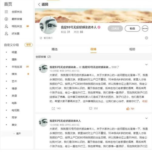 其在微博中写道:“大家好,我就是93号无症状感染者本人,关于大家关心的一些问题在此澄清一下,我是永靖农村的,我是汉族,家里当时对上户口不重视,95年我4岁多的时候,家里人才给我报的户口,按照上户口的时间给我报的出生日期,所以我身份证上是95年的,我老公比我大5岁,我们是08年认识的,属于自由恋爱,后来在他们老家摆的酒席,再后来两个孩子出生,老公一直在外打工,我在家带娃,我们感情一直很好,现在我和孩子们已经感染了病毒,这件事又给我和家人们造成了很大的困扰,孩子们还小,他们是无辜的,希望大家不要再关注了,这件事情到此为止,让我们安心治疗,谢谢你们了。”