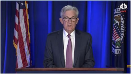 美联储主席鲍威尔在新闻发布会上发言(图片来源:CNBC直播截图)