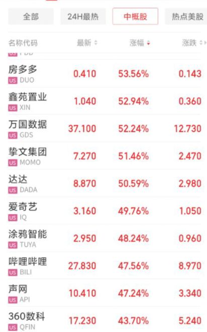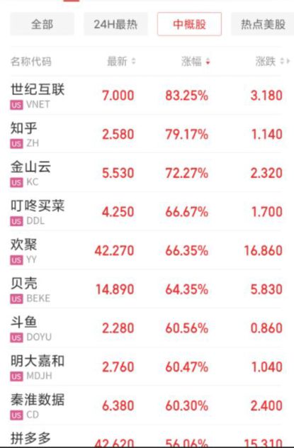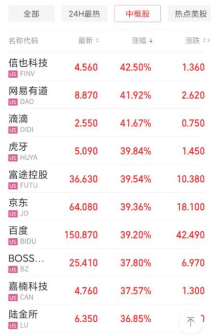 中概股集体飙升,纳斯达克中国金龙指数收涨近33%,多只中概股暴涨,知乎涨近80%,金山云涨超72%,叮咚买菜涨超65%,欢聚涨超67%,斗鱼涨超60%,拼多多涨超56%,爱奇艺涨超50%,哔哩哔哩涨超47%,京东、百度、虎牙涨近40%,阿里巴巴涨超36%。