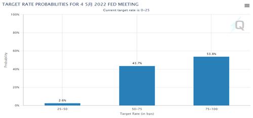 美联储利率决议公布后,芝商所“美联储观察(FedWatch)”工具显示,期货市场对美联储5月份的加息幅度与利率决议公布前变化不大。截至北京时间17日2:35,市场预计美联储在5月4日的FOMC议息会议上加息25个基点的概率为43.7%,加息50个基点的概率为53.8%,按兵不动的概率为2.6%。