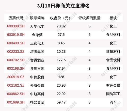 从券商对个股的关注程度来看,有20只个股获得多家券商关注,券商关注数量排名居前的个股是万华化学(600309.SH)、金徽酒(603919.SH)、三友化工(600409.SH)。