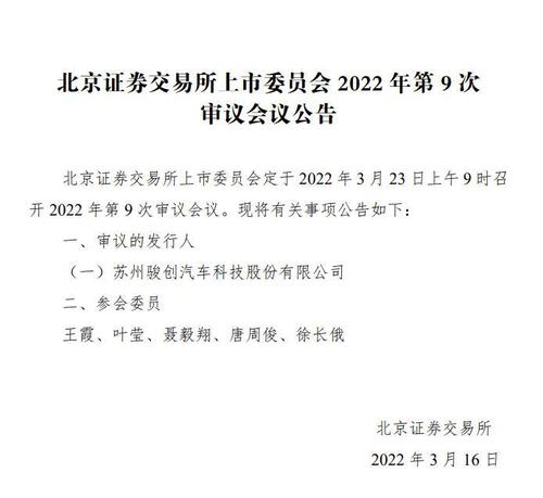 昨日晚间,北交所官网信息显示,北交所上市委员会定于3月23日召开2022年第9次审议会议,审议苏州骏创汽车科技股份有限公司的发行情况。