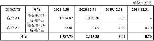 另外,源杰科技持股6.71%的股东宁波创泽云投资合伙企业(有限合伙)于2018年10月入股,背后持股86.46%的有限合伙人为苏州旭创。2020年、2021年上半年,苏州旭创都位列源杰科技前五大客户,2020年销售金额超过4000万。