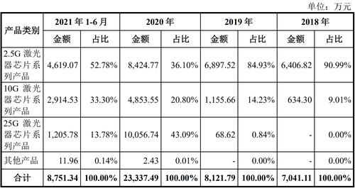 不过,这样的业绩贡献似乎并不持久,2021年上半年,25G激光器芯片系列产品仅占源杰科技当期主营业务营收的13.87%,此部分销售金额为1205.78万元(2020年销售金额为10056.74万元)。