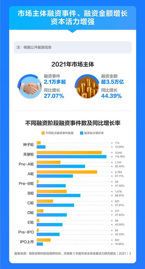 中新经纬3月17日电 2021年我国各类市场主体新增2887万户,相比2012年底增长1.8倍;2021年市场主体融资2.1万多起,融资金额超3.5万亿,同比增长分别27.07%、44.39%……