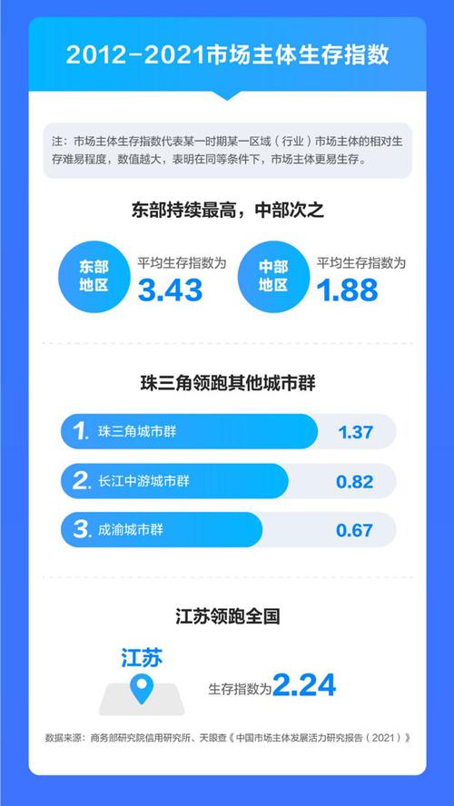 从城市群看,珠三角城市群、长江中游城市群、成渝城市群市场主体10年平均生存指数分别为1.37、0.82、0.67,分列前三,表明以上三个城市群较适于市场主体生存。从地区看,2012至2021年,生存指数最高的省份是江苏省,生存指数为2.24;海南省提升最快。