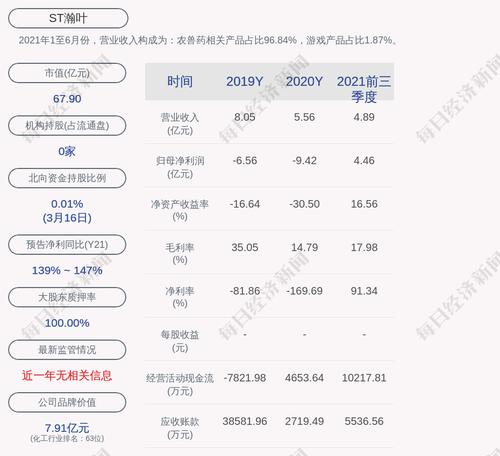 2021年1至6月份,ST瀚叶的营业收入构成为:农兽药相关产品占比96.84%,游戏产品占比1.87%。
