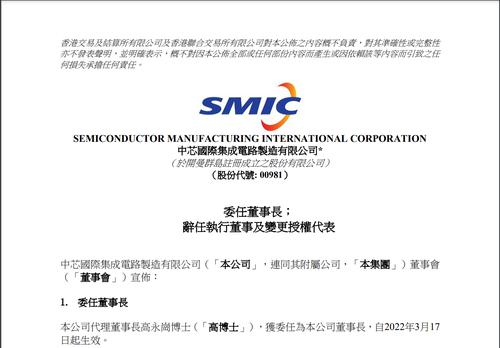 周子学博士因身体原因,辞任中芯国际执行董事职务,自2022年3月17日起生效。周博士已确认其与董事会并无意见分歧,亦无其他与其辞任执行董事职务有关之事宜须提请中芯国际股东注意。
