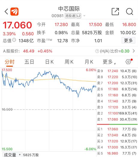 截至收盘,中芯国际报收17.06港元,上涨3.39%,最新市值为1348亿港元。