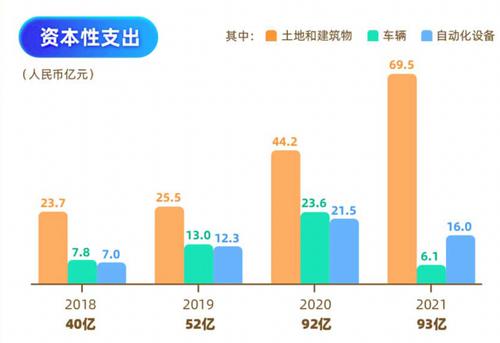 或是为了保证自身的市场优势地位、建立更为稳固的护城河,近年来,中通的资本性支出呈现连年上涨的态势:2018年到2021年间,中通的资本性支出分别为40亿、52亿、92亿和93亿。