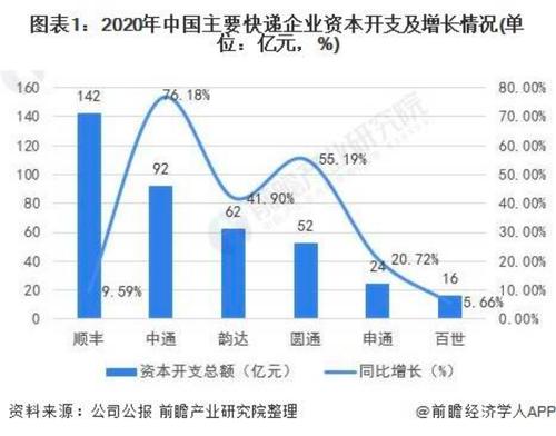 前瞻产业研究院相关报告显示,从行业主要企业资本开支规模来看,2020年顺丰以142亿元位居行业第一,其次是中通的92亿元、韵达的62%亿元;从投资增速来看,行业主要企业均呈现不同程度的增长态势,其中,顺丰同比增长9.59%,中通同比增长76.18%,韵达同比增长41.90%,圆通同比增长55.19%,申通同比增长20.72%,百世同比增长5.66%。