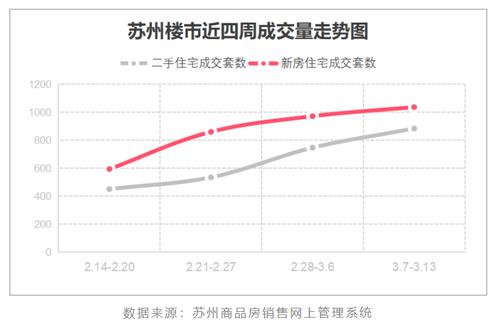 苏州市住建局网签数显示,2月份苏州各区域新房成交量为2585套,环比1月下滑44.7%。随着疫情的平稳,苏州楼市复苏趋势明显,新房、二手房的周成交量均迎来了四连涨。截至3月10日,苏州新房成交量已达1812套,按此趋势大概率会超过2月。