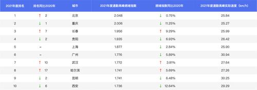 根据报告,2021年我国各大城市的交通拥堵情况得到改善。在百城通勤高峰交通拥堵排名中,近七成城市的通勤高峰拥堵指数较2020年有所下降。其中,北京、重庆、长春位列拥堵榜单前三。