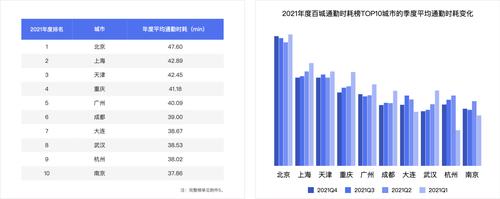 通勤时耗也是衡量各大城市交通效率的重要指标,以及城市空间和宜居水平的综合体现。在百城通勤时耗排名中,前十名城市依次为北京、上海、天津、重庆、广州、成都、大连、武汉、杭州、南京。其中,北京的年度平均通勤时耗达到47.6分钟,分别为上海的1.11倍、南京的1.26倍。