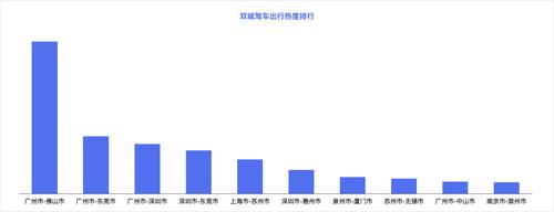 随着经济社会快速发展,城际出行需求日渐成为刚需。大湾区交通互联互通提速背景下,广州、深圳等一线城市持续加强与周边城市融合发展,广东地区迎来跨城出行热潮。其中,广州市-佛山市、广州市-东莞市、广州市-深圳市、深圳市-东莞市、深圳市-惠州市等位列双城驾车出行热度前列。
