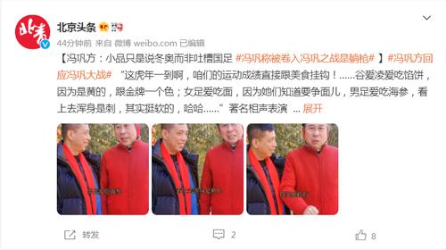 日前,一段冯巩与搭档贾旭明说的小品短视频引起网络热议,3月16日还上了微博热搜,有网友质疑他吐槽国足,随即被卷入巩汉林与前男足队长冯潇霆关于中国足球的话题争议之中。此外,足球评论人@董路也进行回应。