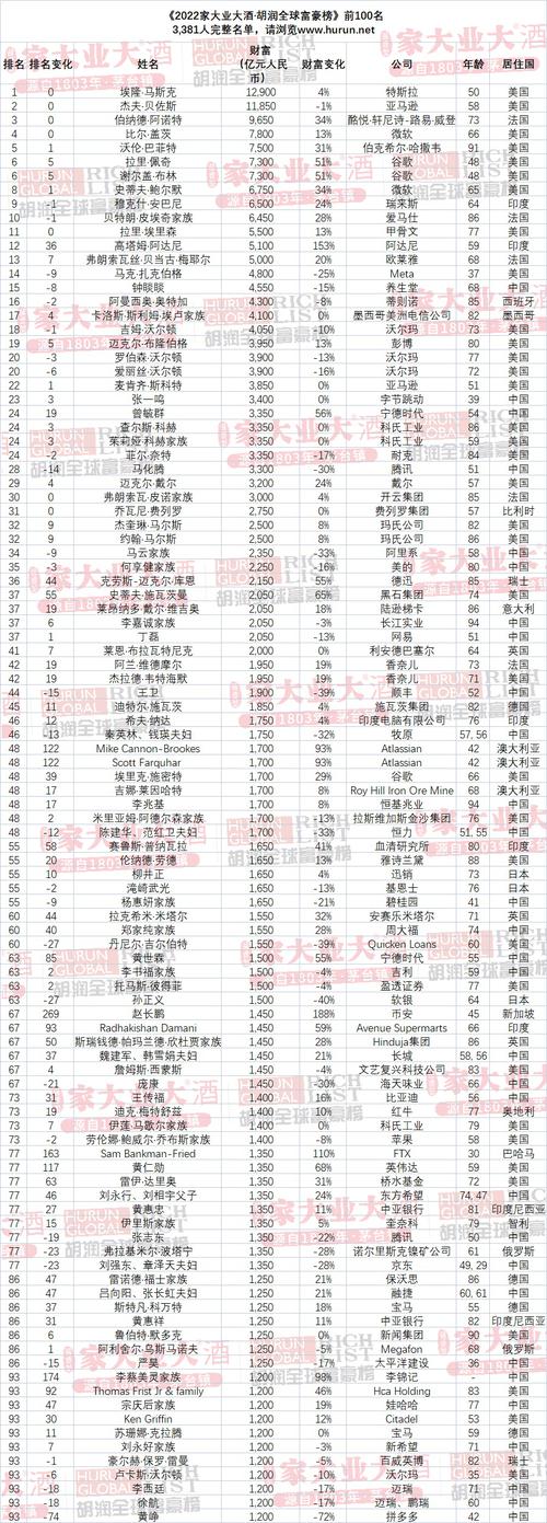 中新经纬3月17日电 胡润研究院17日发布《2022家大业大酒·胡润全球富豪榜》。榜单显示,排名中国前三的富豪分别是钟睒睒、张一鸣、曾毓群。此外,特斯拉创始人50岁的埃隆·马斯克以1.29万亿元人民币连续两年成为世界首富。