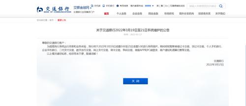 交通银行公告表示,为提高我行系统运行效率和业务体验,我行将于2022年3月19日凌晨0:00至21日凌晨5:00进行系统维护。期间将短暂影响借记卡交易、贷记卡交易、个人手机银行、企业手机银行、二代支付交易、数字货币交易、网上支付交易、刷卡交易、条码交易、商服APP和PC端登录、商户通知和清算归集等交易。