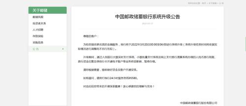 此外,中国邮政储蓄银行公告称,为给您提供更优质的金融服务,我行将于2022年3月20日00:00至06:00进行系统升级(系统升级结束时间将依据实际情况进行调整而不另行告知)。