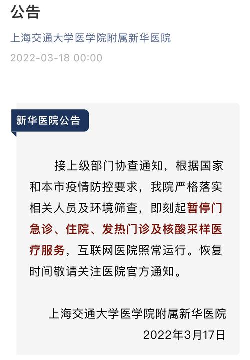 18日,据上海交通大学医学院附属新华医院,接上级部门协查通知,根据国家和本市疫情防控要求,该院严格落实相关人员及环境筛查,即刻起暂停门急诊、住院、发热门诊及核酸采样医疗服务,互联网医院照常运行。恢复时间敬请关注医院官方通知。