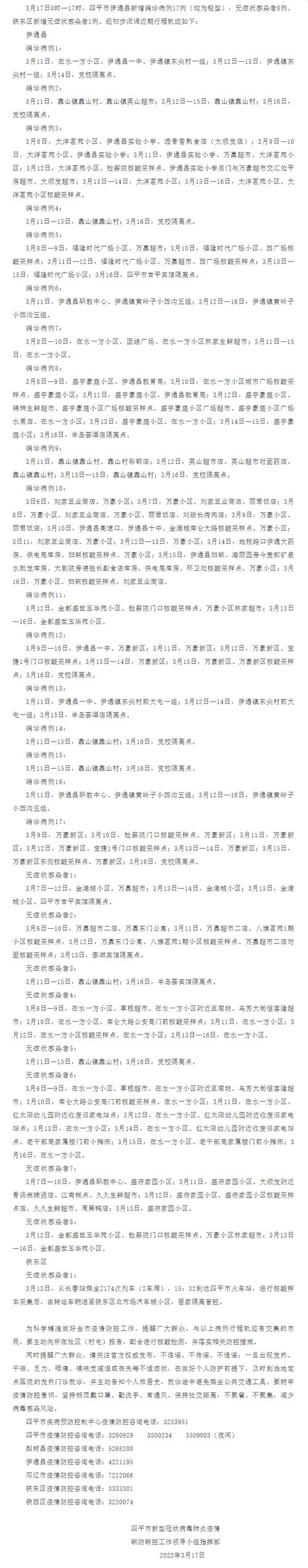 3月17日0时—17时,吉林四平市伊通县新增确诊病例17例。 具体通报如下: