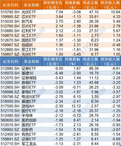 在行业主题ETF方面,本周份额增长超过1亿份的有10只基金,其中光伏ETF(515790)、芯片ETF(159995)和新汽车份额分别增加了7.04亿份、3.64亿份和2.75亿份,分别净流入资金10.6亿元、4.33亿元和5.49亿元。